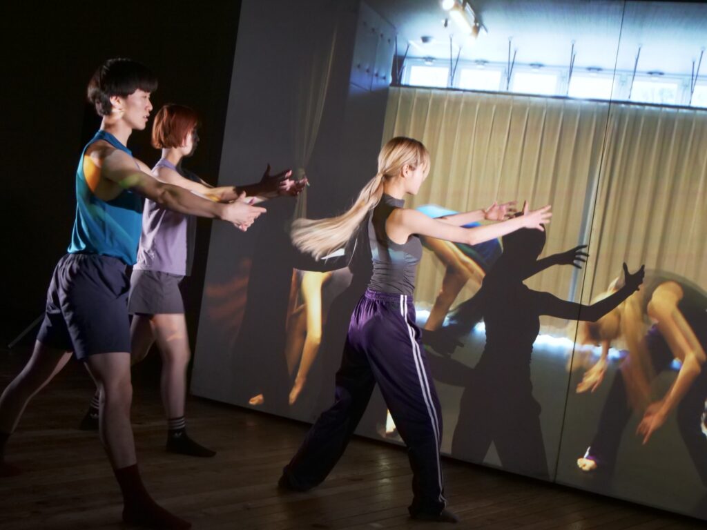 他にも稽古映像と一緒に踊るシーンがあったのですが、過去の自分たちと同じ振付を揃えて踊るという構造を作りました。3人で踊っているのにまるで6人で踊っているような見え方をするので、見ていて純粋に楽しい時間だと思います。一方で、途中で映像をストップさせたり、構成を複雑にすることで、観客に「驚き」を提供できると考えました。それも演者は即興的にストップしたりアレンジするため、楽しませる意識よりもその瞬間に集中する意思の比率が高くなると思います。